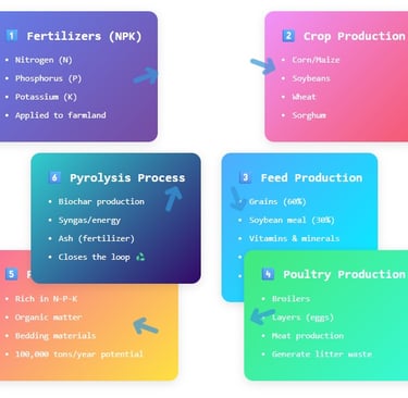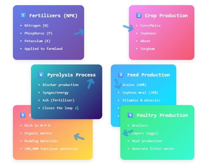 Complete Circular Economy: Fertilizers → Crops → Feed → Poultry → Litter Waste → Pyrolysis → Fertilizer/Biochar